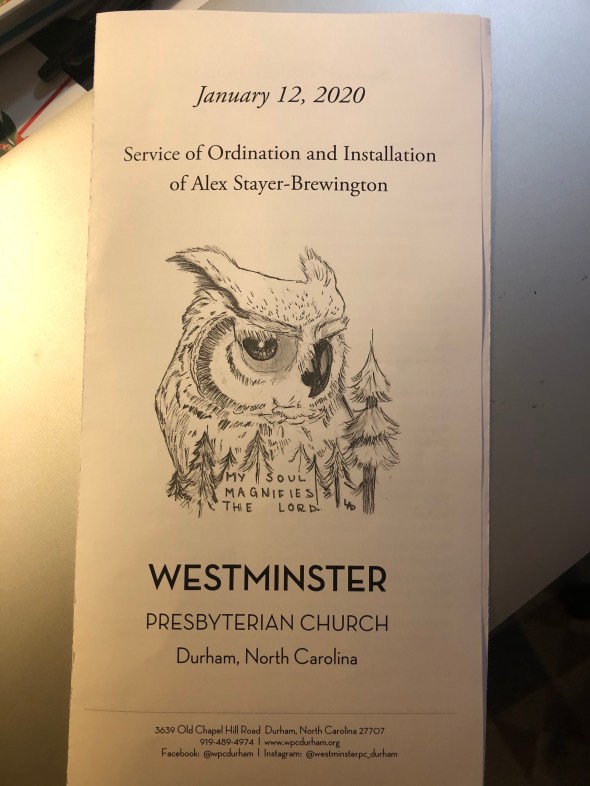 Posted: January 12, 2020 Filed under: Uncategorized Leave a commentThere are very few Sundays when a Russ and I go to two church services on the same day. Today was one of those rare days. Since I was the lector at the 11:00 AM service we kind of had to go to that one. It was a good service, regular Westminster Sunday, but this afternoon we went back to church for a very special service, the ordination of our new youth pastor, Alex.