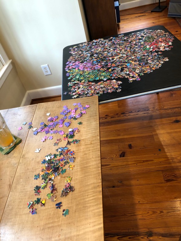 After cleaning my office while they tiled I finally game myself a break and went to work on my giant ass puzzle. I was sitting in our big room listening to the tile guys talk while I searched for the missing piece. Jorge, who is from a Mexico, was talking about going to a soccer match. One of the old white guys asked him if his father was going to go with him. Jorge said, “No, he is too afraid.”
