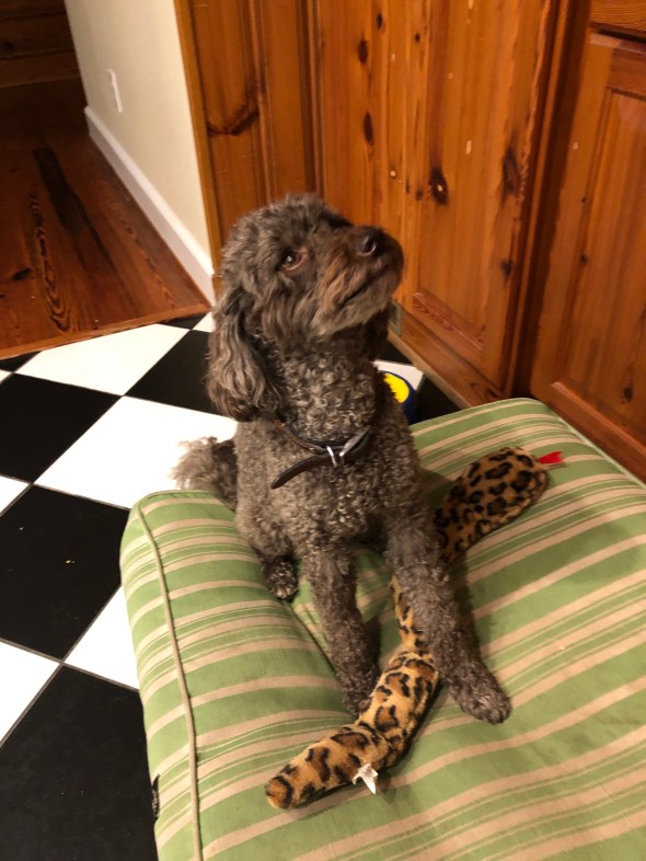 Once you have adding just a little cheese and she has eaten to her satisfaction she will lie on her bed with her head on her toy snake, which is alway on her bed. Other toys travel throughout the house, but not the snake. It belongs on her green bed.