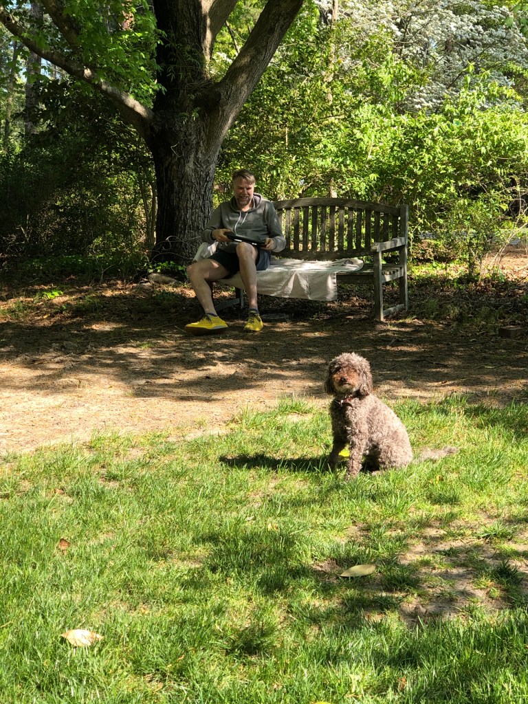 While Russ works in his outside CMG office, the bench in the front of our house, Shay social distances and watches him from the grass. I came up from working in the sweat shop and found Shay lying on the front porch all alone. She was not barking at the walkers or even lifting her head as canine pals passed by. She knows she has to keep her distance, like all of us. She just doesn’t like it. She is a social animal and is looking forward to the time when she can greet you and snuggle.