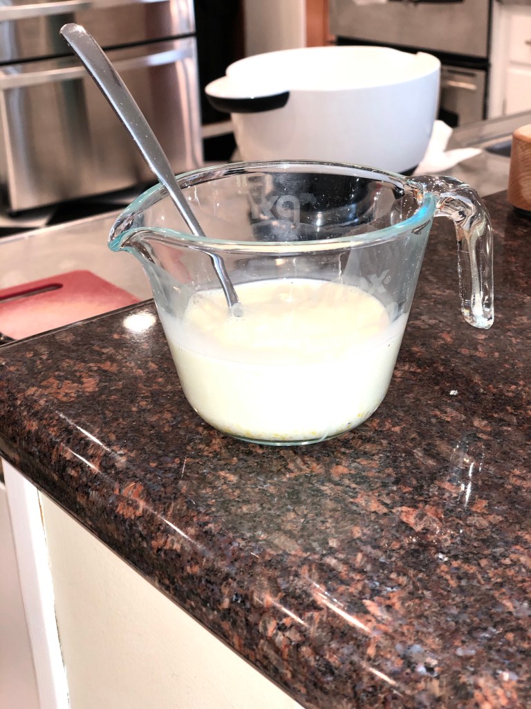 Using the kitchen scale put a measuring cup on top and zero out the scale. Add the egg and then add enough heavy cream to make the total weight 150g. Whisk the egg and cream together in the cup and set aside.