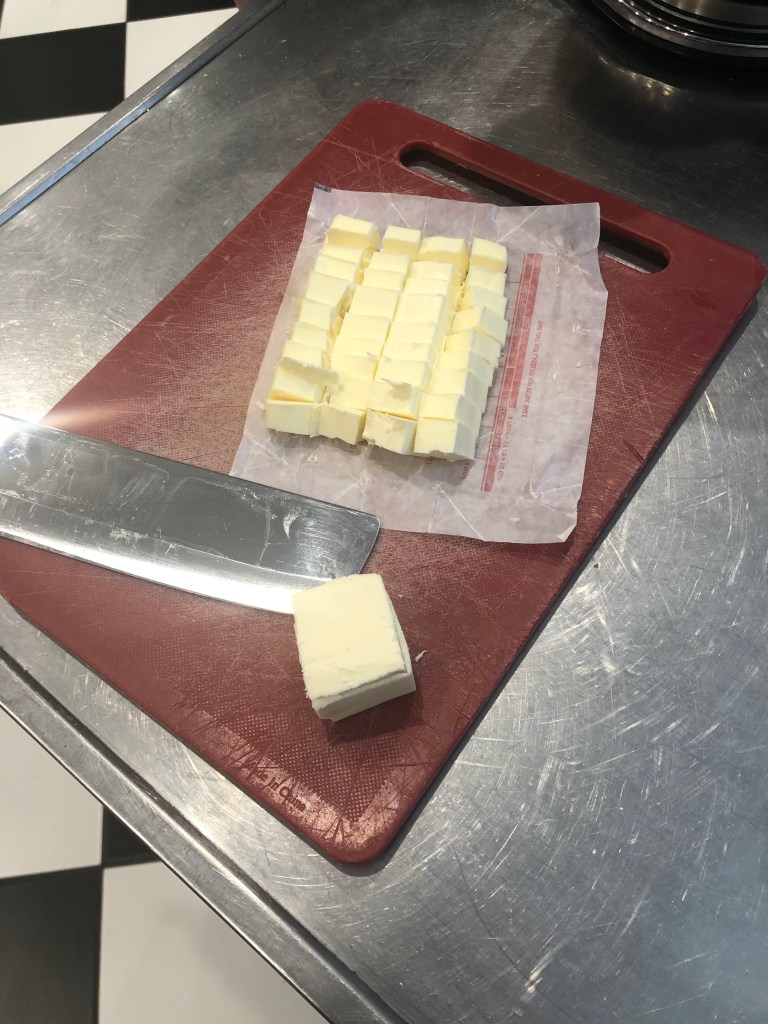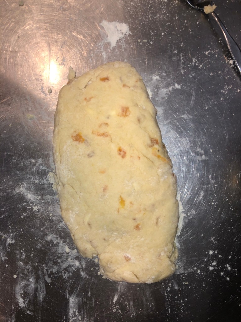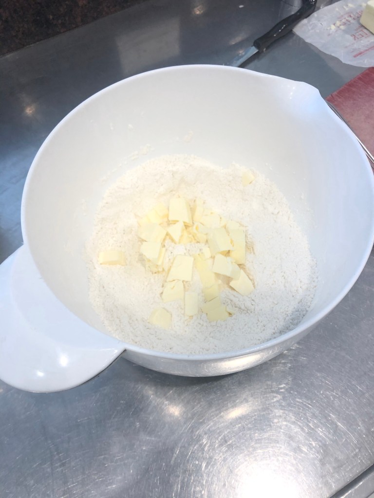 Remove the bowl from the scale and add the butter. With clean hands working quickly, work the butter into the flour mixture until it resembles sand. Add the egg and cream mixture mixing it just enough to make everything wet. If you are adding fruit, do it now.