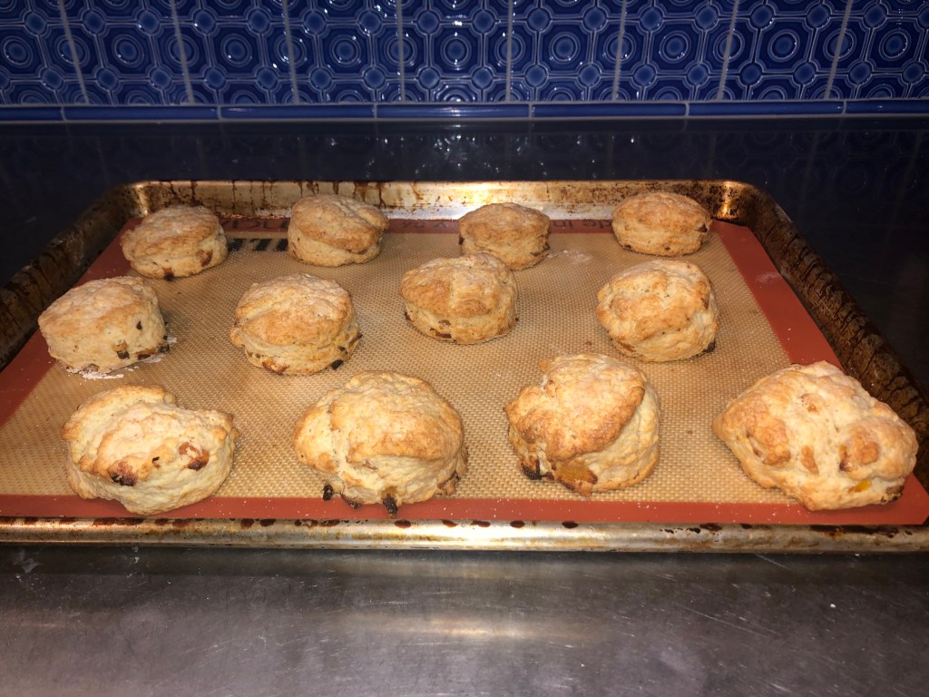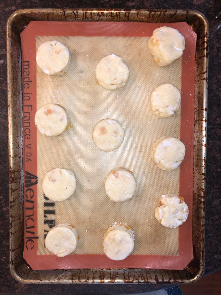Place a silpat on a cookie sheet or use parchment paper. Using a biscuit cutter cut scones from the slab of dough