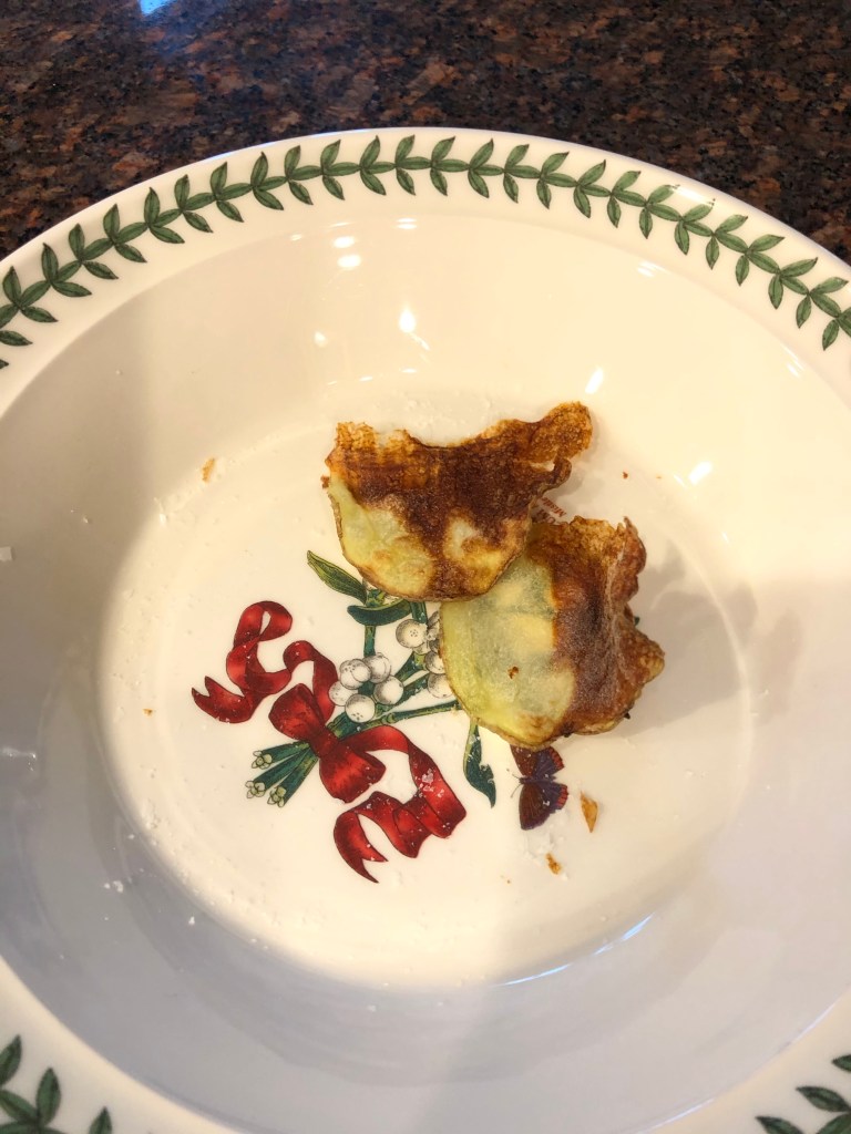 The machine sat on the counter for two weeks, unused. I wanted to move it to the appliance world down stairs, but I was voted down. Tonight Russ and Carter decided to make potato chips. They got out the serious french real mandolin and sliced the one small potato which was slightly bigger than. A golf ball, but smaller than a tennis ball. They soaked the slivers of potato in water and the dried them. At last time to air fry them.