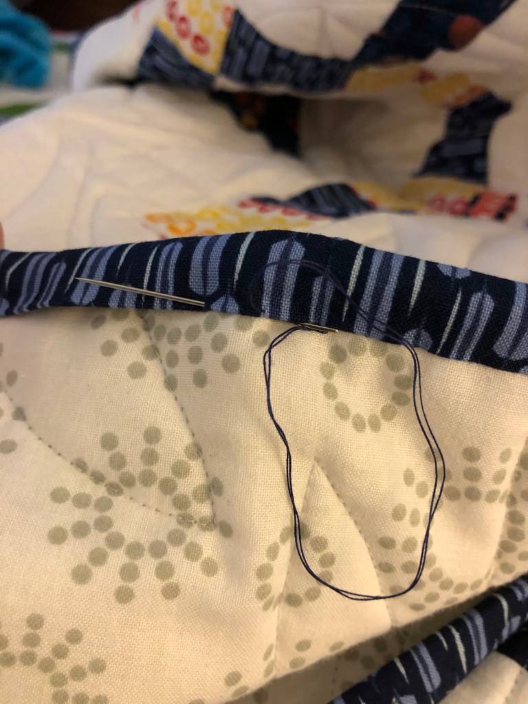 My quilt came back and so I am taking a mask break and I am putting the binding on the edge of the quilt which will complete this project. The binding is the slowest part of the job because first I have to create the binding by attaching two and a half inch strips together end-to-end, ironing it in half and sewing it with the machine all around the edge of the quilt. Then comes the hand sewing where I fold the binding over the raw edge of the quilt and attach it to the back.