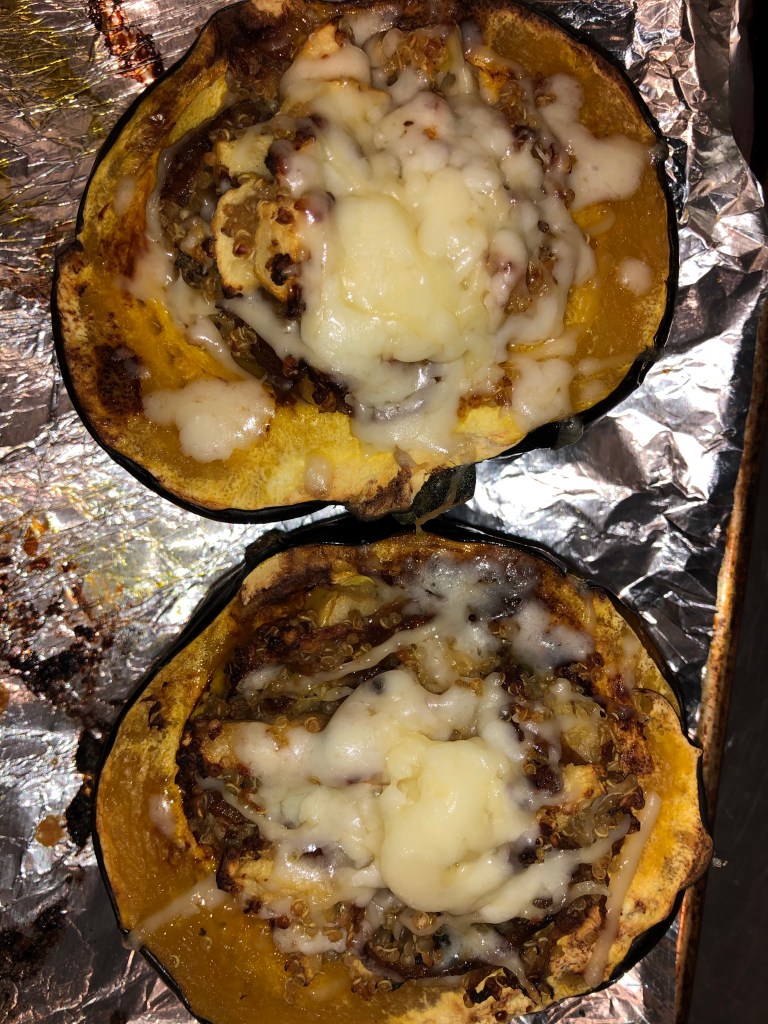 Posted: April 28, 2020 Filed under: Uncategorized Leave a commentTonight was a “eat what is in the fridge night.” Russ is always good at scavenging and creating new meals out of previous ones. Carter was unsure of what she wanted as there was not a huge stock of protein choices. I looked around at what needed to be eaten and focused my eye on a lone acorn Squash. I decided to make a stuffed squash and was very satisfied with the outcome. Half was a perfect meal.