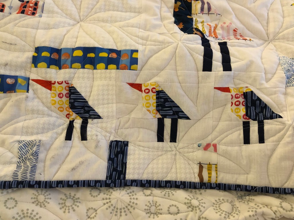 The quilt is completely random with different sized sand pipers and blocks. As I got to the bottom I needed to make it even out and my favorite parts ended up being three little matching sand pipers in the corner to represent myself and my two sisters.