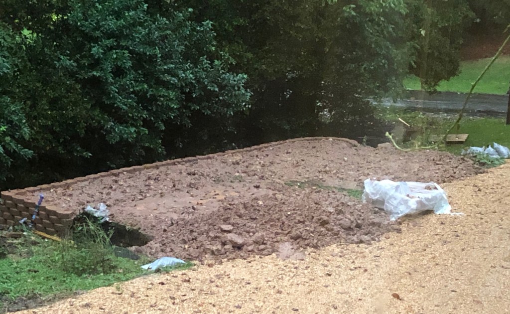 Then my fill dirt arrived. 20 yards is a lot of dirt. They did a good job of dropping it where I need it in two different loads. I shoveled about 2 yards worth and felt like the wall is well supported for now. I had worked for five and a half hours non-stop with my only rest being driving to and from Lowe’s. I knew I had to stop or else I would be no good tomorrow.
