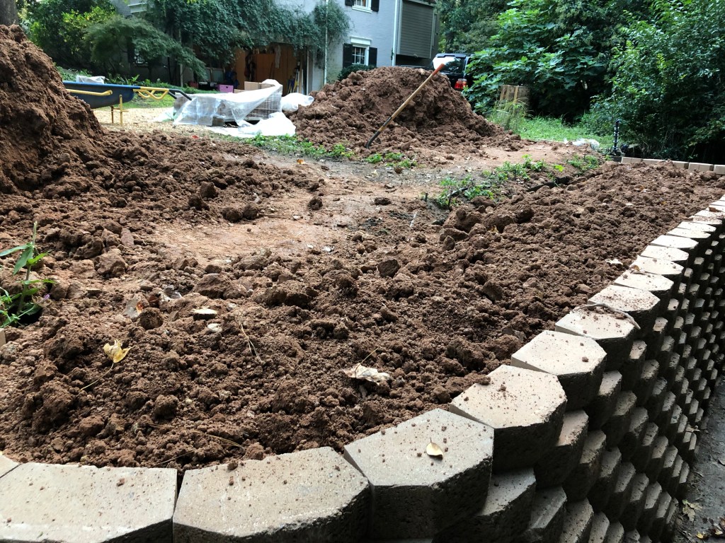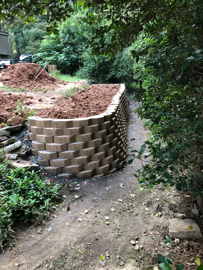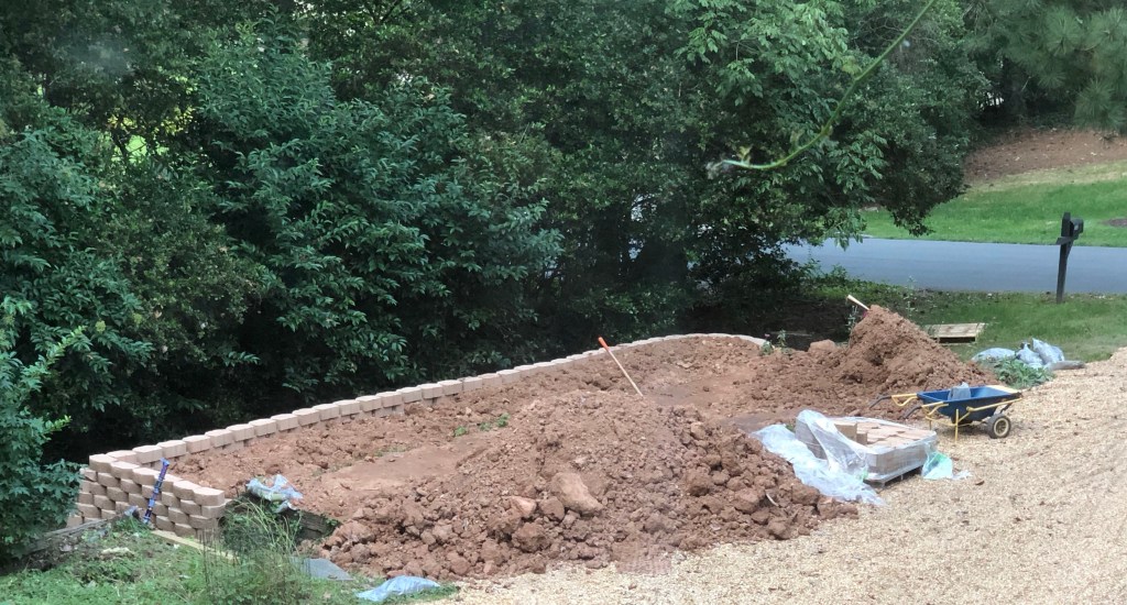 Posted: October 21, 2020 Filed under: Uncategorized 1 CommentPlanning out this garden project I chunked it into four sections. The first was expanding the flat surface by 100 percent by building a forty foot retaining wall that was four feet high. This was the most physical part of the project, the most boring and the one I did mostly alone. The building was not that boring, but the shoveling the clay fill dirt was hell. I calculate I shoveled 72,000 pounds thanks to the rainy days soaking the dirt.