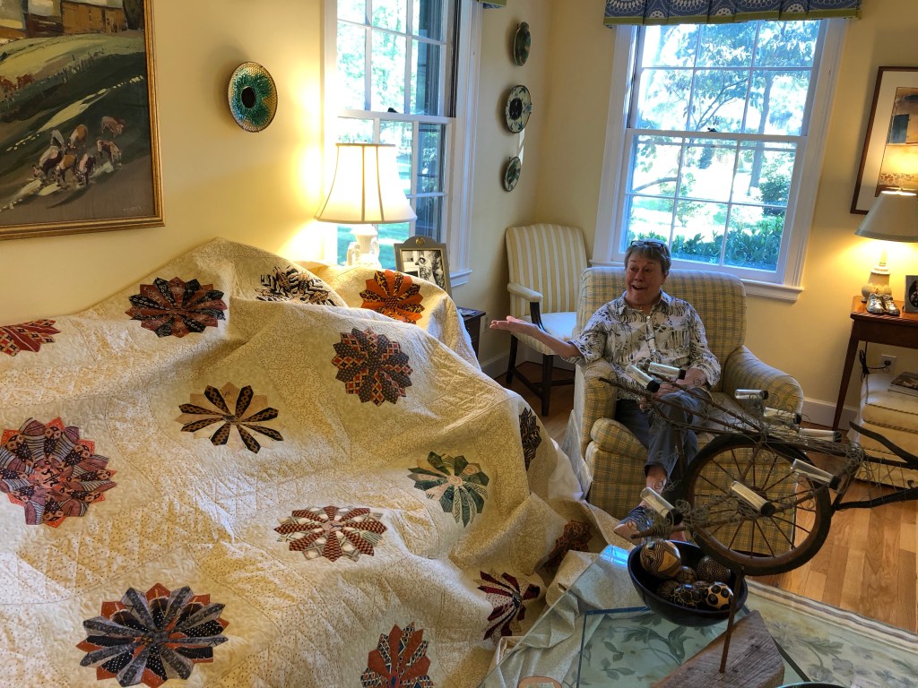 I put a binding on the quilt made out of the same material as the frames so that Carol’s work would be the star of the quilt. When I showed it to her she cried. Even her husband Jack appreciated it. It was a wonderful collaboration to work on this beautiful work of art.