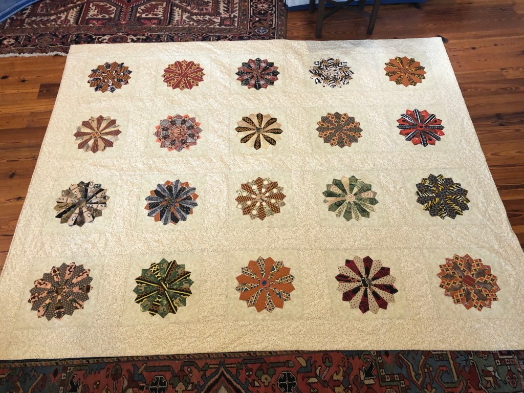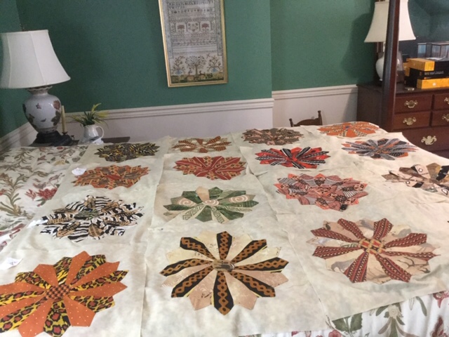 The next day Carol emailed me photos of her squares. They were beautiful hand appliquéd Dresden plates made from fabric she and her husband Jack bought on a trip to South Africa seven years ago. She had carefully picked out just the right patterns for the pieces and had lovingly sewn them and then got stuck about how to create a quilt with them. She told me the squares sat for a few years while she discussed the possibilities with various quilters.