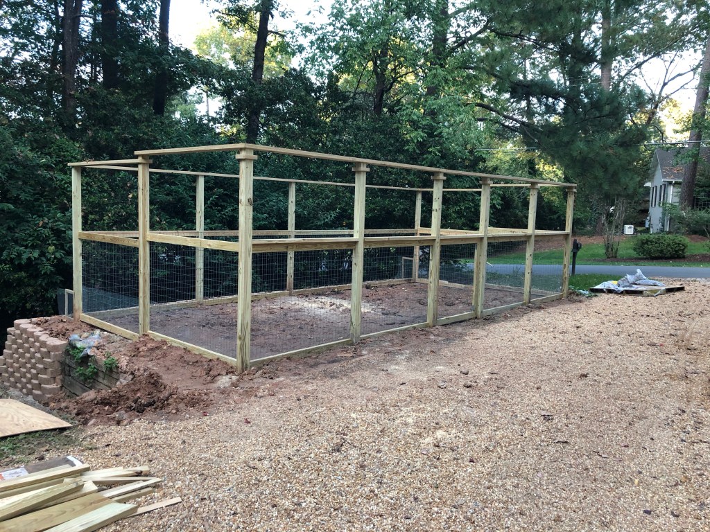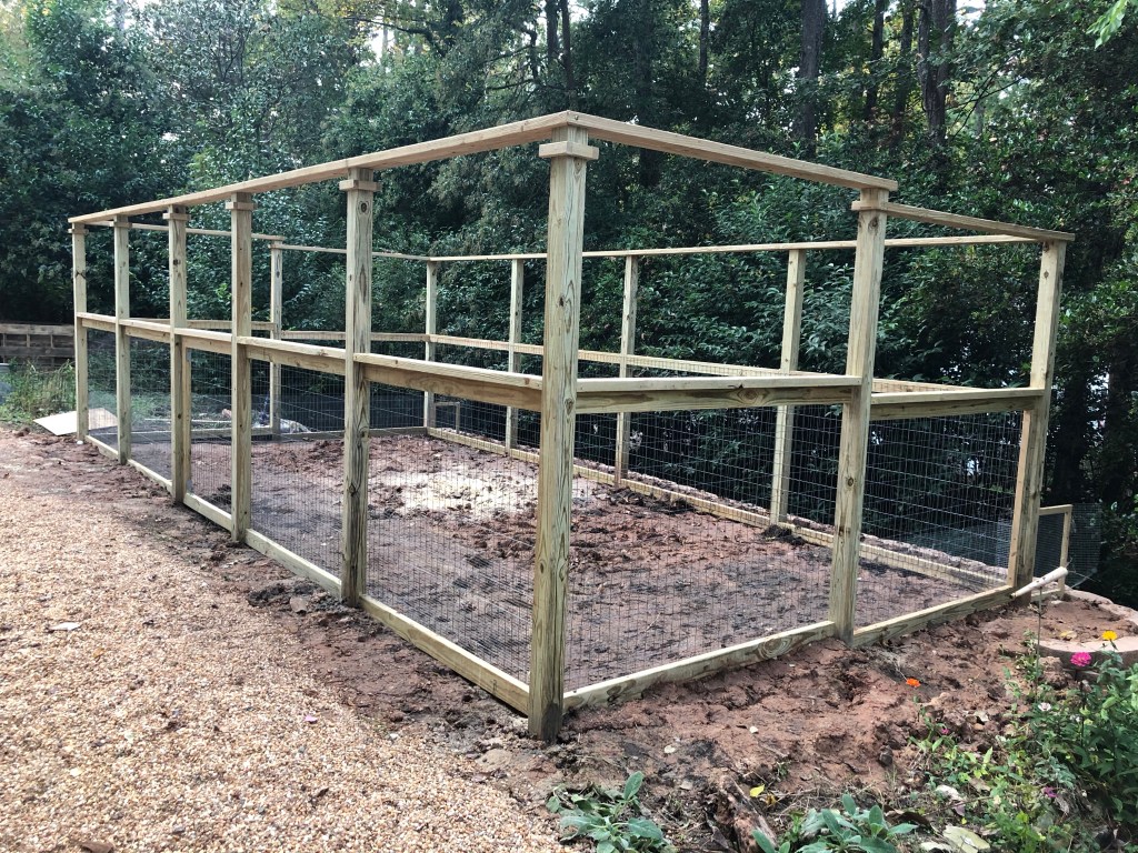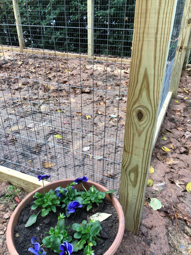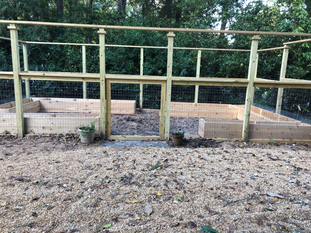 The second phase of the project was building the garden enclosure. After looking at hundreds of Pintrest pages of garden fences I designed what I thought would serve me well that I could do myself. I purchased the materials and had a church friend come and help me build it. We did the posts in one day, cementing 13– 10 foot four by fours around the perimeter. We framed it another day. On the third day we attached the wire which included 2×4 inch big wire to keep deer out and 1x 1 bunny wire that runs into the ground. David also built the garden gate on the third day. The fourth day he came back for a couple hours just to do a little finish work to give the enclosure a look that was a step up from a deer fence.