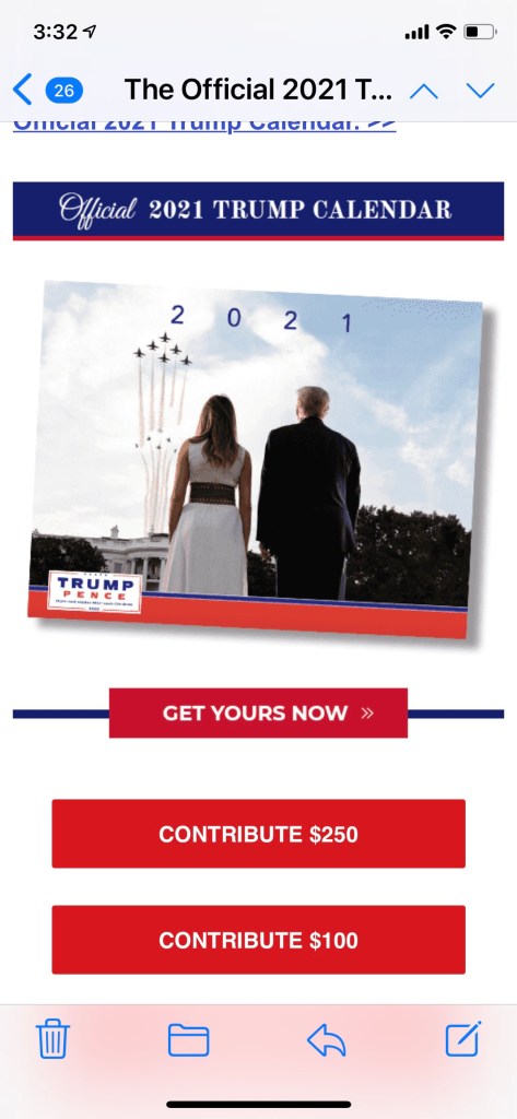 Twice this week I received this e-mail from Melania Trump titled, “The Official 2021 Trump Calendar.” I want to know who in the Trump organization thought it was a good idea to have the woman who used to pose nude for a living offer a calendar? I am of an age when I had to endure calendar’s of nude women hanging up in mechanic’s garages when I went to get my oil changed in my car. I never quite understood how it was OK to display those in public places. So when a former nude model offers a calendar that is the first thing that comes to mind.