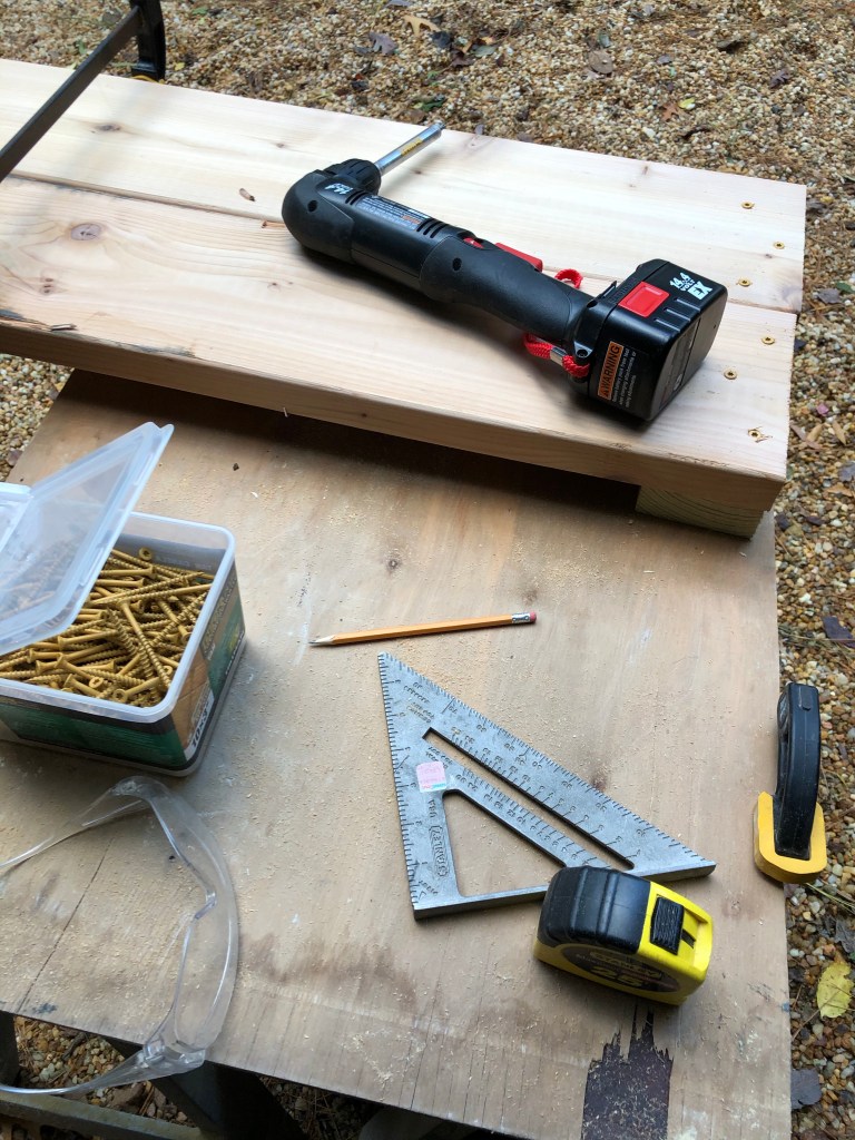 Since he is working twenty hours a day I don’t like to ask him to help me, but I see I am going to need his help this weekend as he will only have work, but no zooms. So to keep moving forward I made the long panels of the raised beds which involved fastening two eight or ten foot board together with a brace in the middle and a brace on each end, which the short two foot pieces will be attached to.