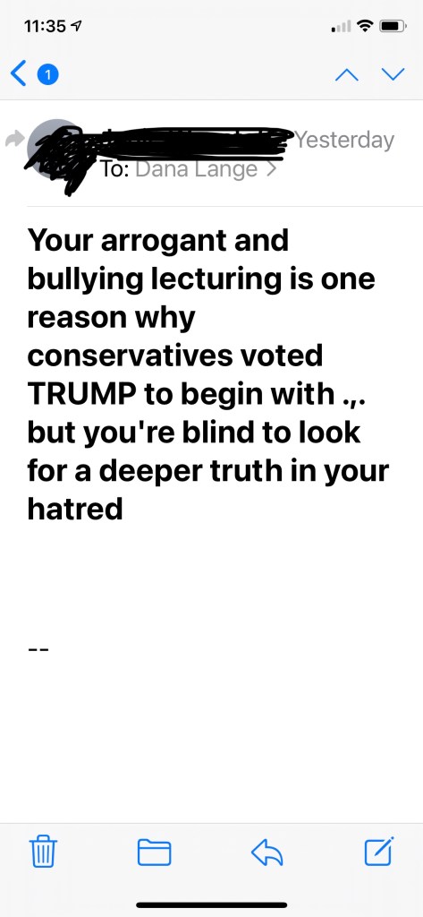 I am not going to out who it was, as many of my readers know this person. I did respond to her by saying, “You are right. I have hatred for Trump, but not you. Please reread the blog with that in mind.”