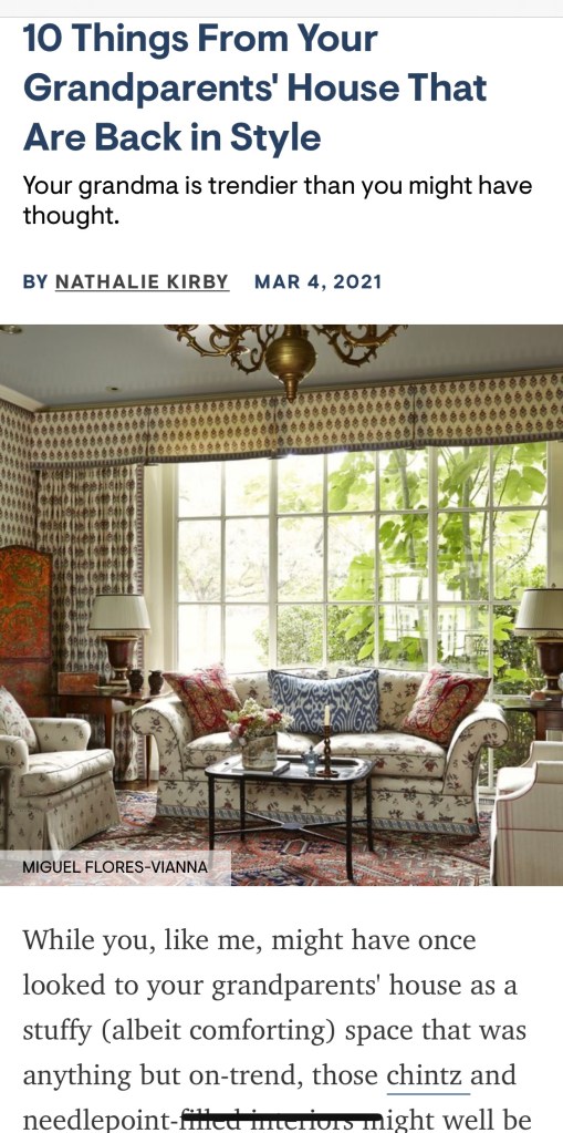 Russ started laughing out loud as he read something on his iPad. He turned to me and said, “We are cooler than I thought.” The barometer he was using was an recently published House Beautiful article, “10 Things From Your Grandparents’ House That Are Back In Style.” As he read me the list I laughed. We are actually the grandparents in scenario, we just don’t have a grandchild to spoil.