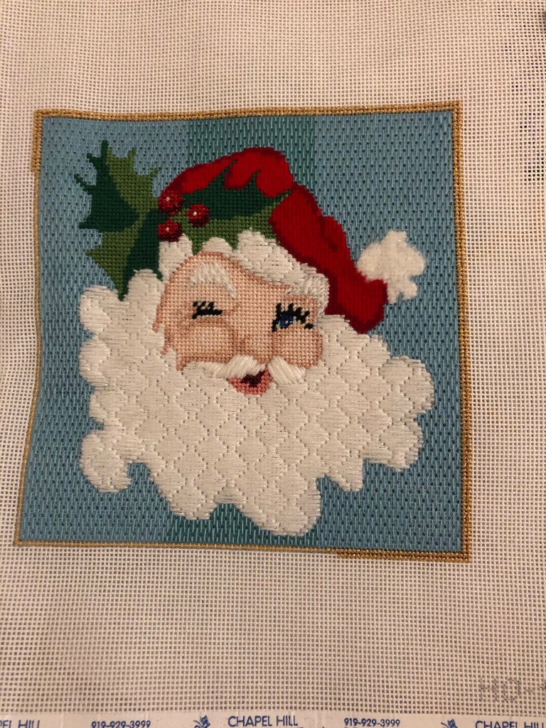 This year you better have your canvas’ done by June. So this weekend I pushed through on this 6×6 Santa. It is bigger than the normal ornament, but I like varying sizes. I plan on finishing the last bit or gold boarder during the Harry and Meghan interview with Oprah tonight. No guilt in needlepointing while watching royals.