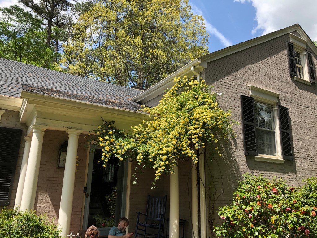 My very old lady Banks Rose over the front porch is at last exactly the shape I envisioned when I planted it 20 years ago. I fight with my gardeners who come and cut the hell out of it every year without consulting me. I have documented it this year and am going to have a big talk with them so they know it is perfect.