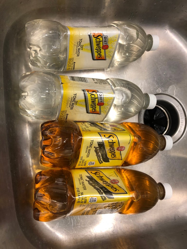 If you are a hoarder or someone planning for some apocalypse so you stock up, let me give you some advice. Tonic Water does not keep. Finding these four bottles of tonic, two diet and two regular was a study in what not to keep. The regular tonic had turned brown in the liquid and the bottle. Amazingly the diet did not turn. But all the bottle went from being round to being triangular. They did have a date on them, it was just 2013.
