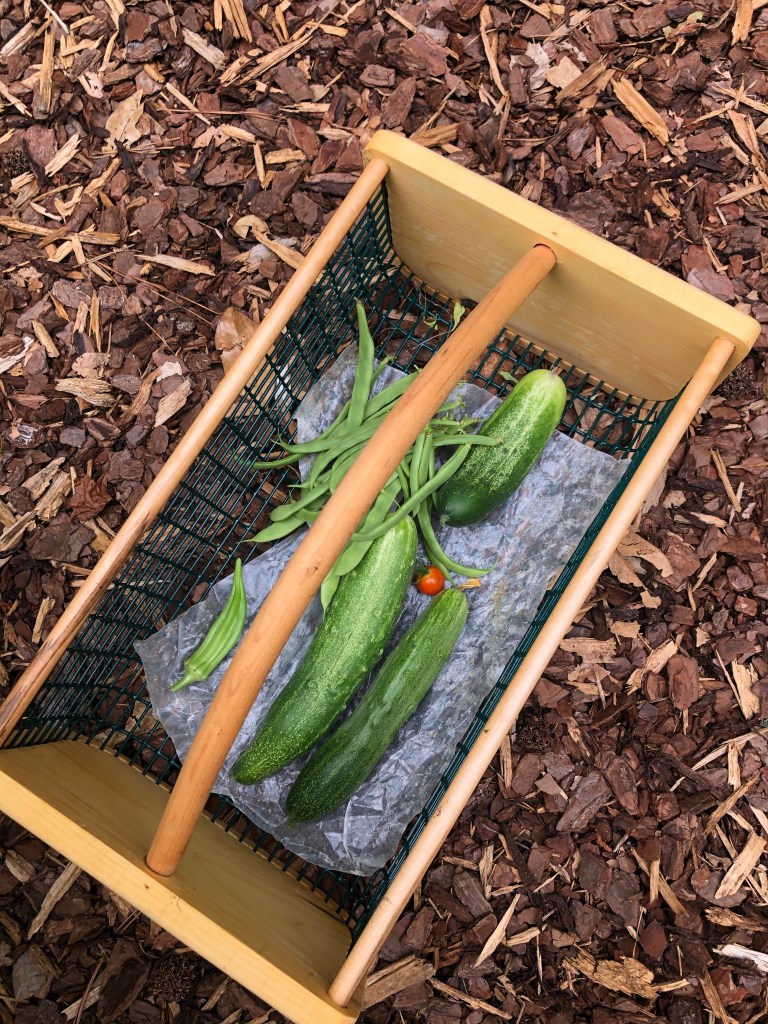 Today I had three nice cucumbers. Those vines have been prolific. I have already gifted cucumbers and pickled a bunch. I had one tiny cherry tomato. It is actually my third tomato. I picked my first two day before yesterday when my friend Lane was visiting and we ate them standing right in the garden. There are hundreds and hundreds of green tomatoes on my plants. I know that most will ripen all at once and I will have my hands full.