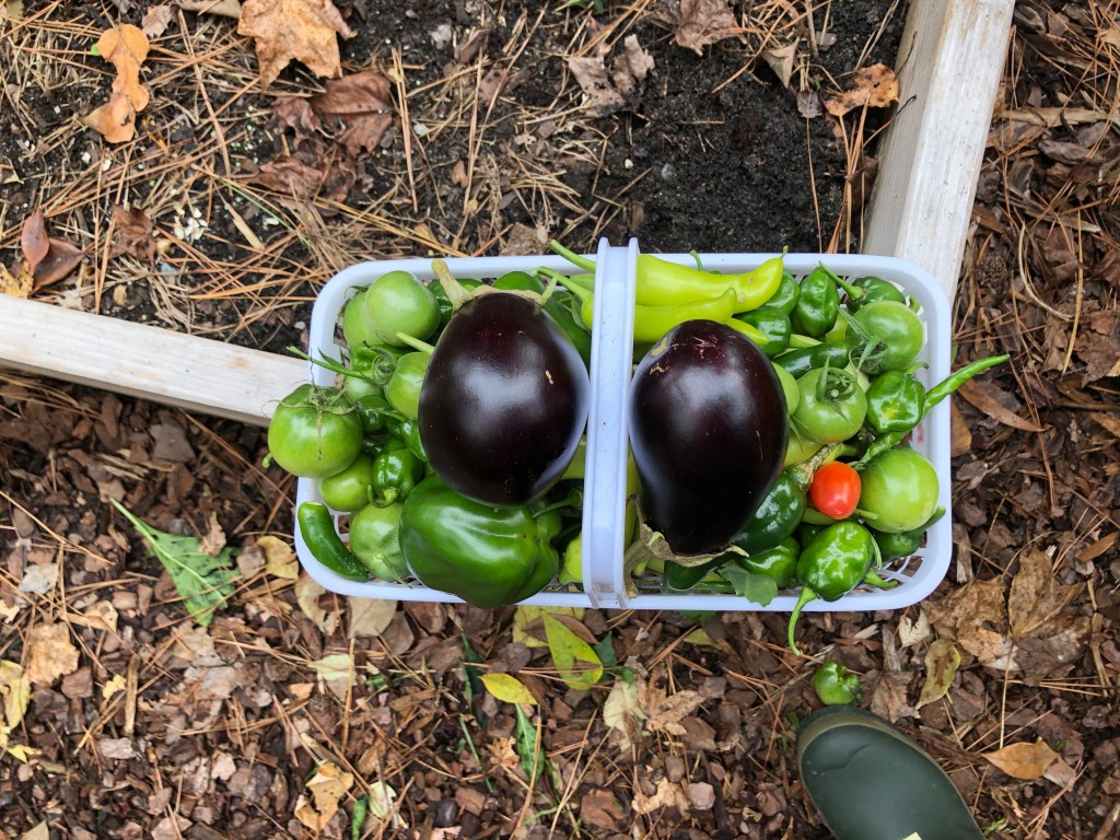 Todays’s final basket was over flowing with red and green tomatoes, seven different kinds of peppers and two last lonely eggplant. My garden does not get much sun in the winter months, but I have some arugula, kale and Swiss chard in it now with some herbs. I am not growing any thing else during the winter. So the boxes will rest and I will replenish with compost as fast as I can make it.