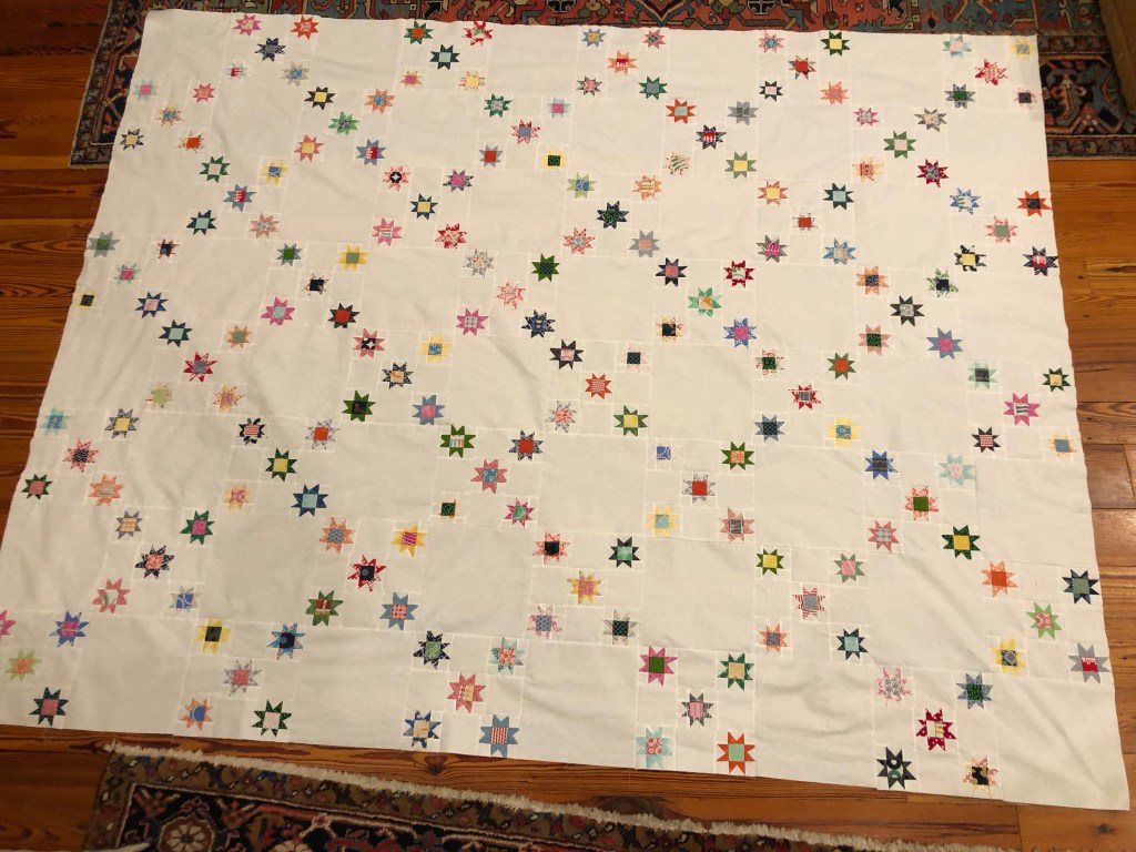 Then I had to cut out all the white squares and make nine patch bigger squares with five stars and four whites. Then I had to square the nine patch squares. Then cut bigger white squares and sew strips of star squares and white squares ten blocks long. Then sew the strips together. That takes me up to today – Five months. Now I have to design and make the framing pieces so the quilt is the king size I want it to be. That won’t take too long, as it will be a colored strip of every fabric in the quilt with two white strips around it. Maybe I can get it done tomorrow. If not, it will be another week as I am booked all this week.