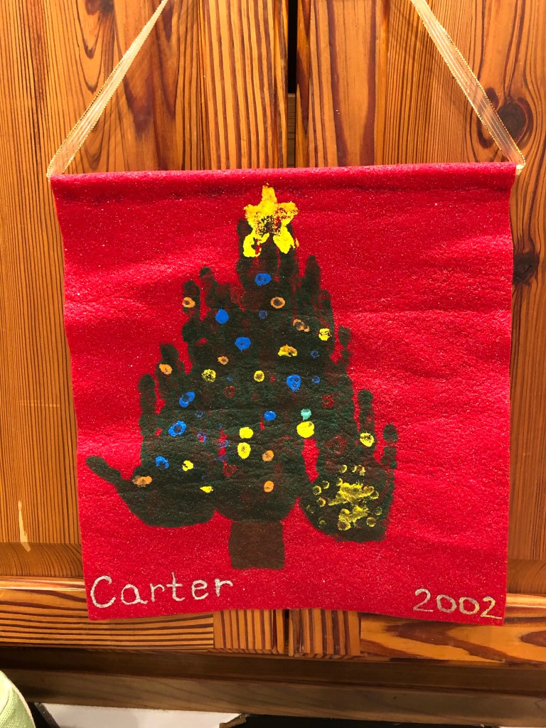 As I think back on my memorable gifts, both those given and received, it is mostly the handmade ones that I truly remember and love. Some are true works of art, like a painting of my mother’s I was gifted rather than having to purchase (which yes, even I have to pay for her paintings.) or a quilt I made for my mother. Those are somewhat priceless gifts, but I’m not really thinking about those special gifts. I am thinking of little things, like this small Christmas Tree banner made by Carter in Pre-school, which I lovingly display every Christmas. Even though it was a school project, wrapped by her teachers so that each child had a gift for their parent’s at the tender age of four, I love it as much today as I did when I opened it nineteen years ago.