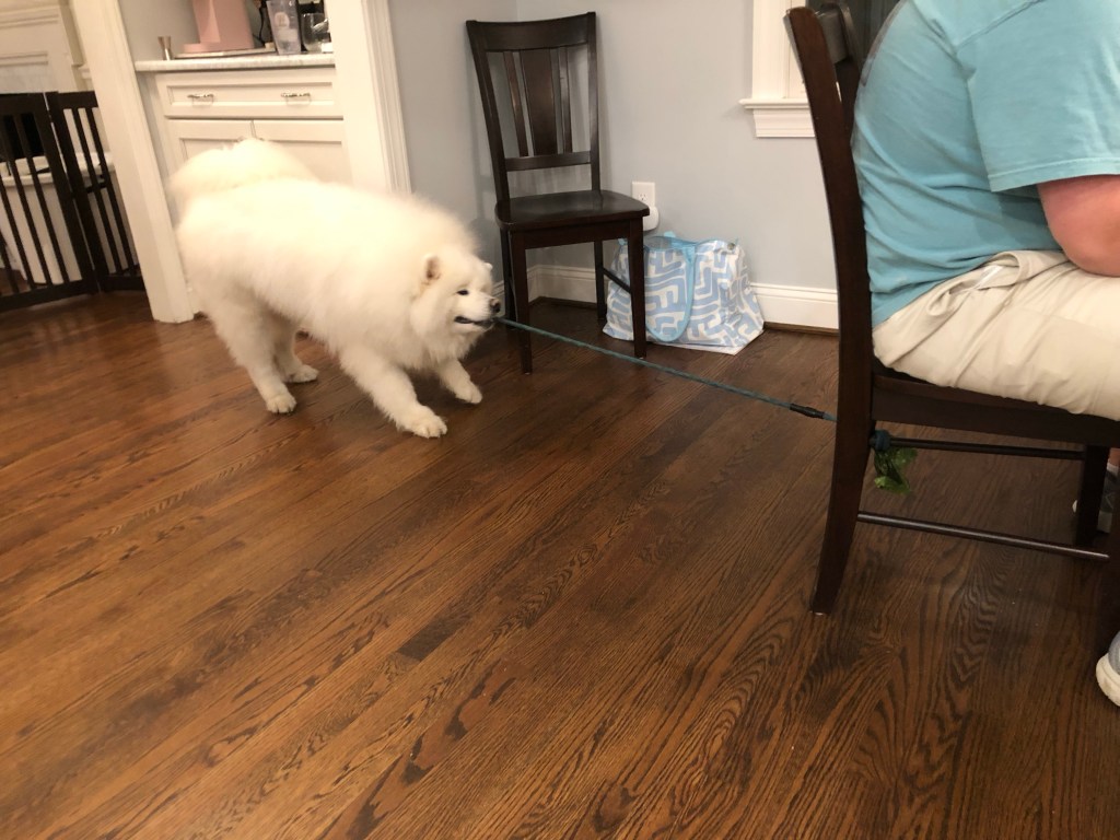 The only one who was not happy about the Mah Jongg lessons was their very fluffy dog, Juno. Juno eventually had her leashed tied to one of the player’s chair. That did not stop her from trying to pull the chair over.