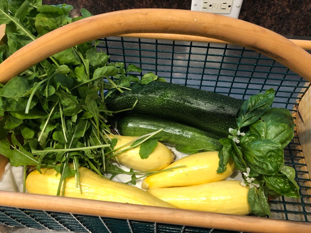 We had a long cold spring. Due to that, my garden went in a little later than I wanted, but it’s finally starting to produce. That means I have my self imposed rule of having to eat the majority of things from the garden at each meal. I made a crustless spinach Quiche with the last of my spinach for breakfast. I had an arugula salad with basil for lunch and I made zucchini pasta for dinner.