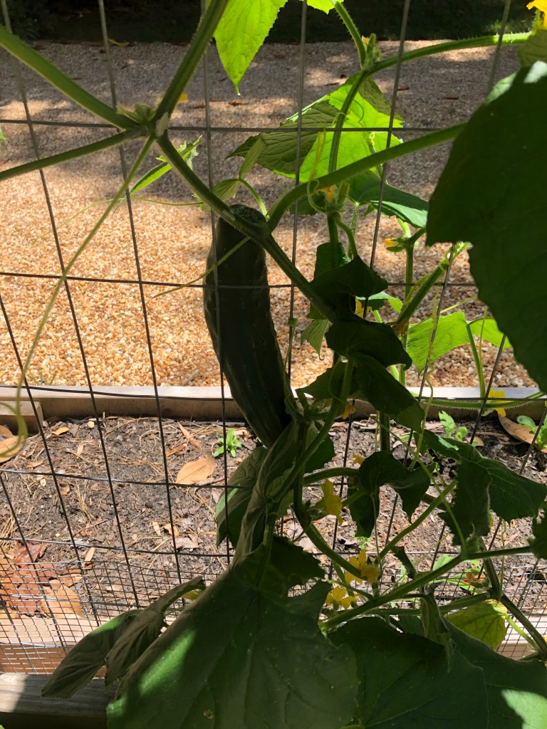 My favorite thing I discovered is how many cucumbers grew half inside the fence and half outside the fence. Picking them was tricky as I had to make sure they did not fall on the outside of the fence. Thankfully none of them had grown too big so that I couldn’t pull them through the wires.