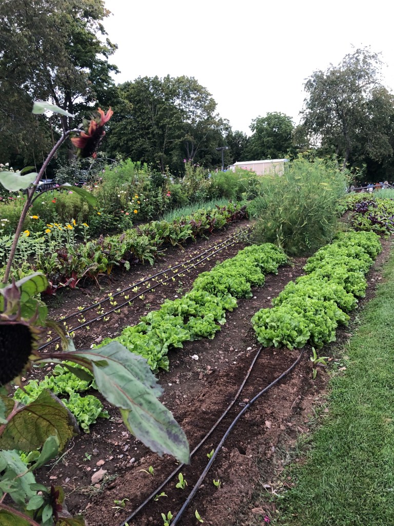 We went early tonight so we could walk around the gardens and admire their perfect rows of many types of lettuce, and Swiss chard and fennel. They do grow a perfect garden. Then there are the chickens and the pigs. So many chickens doing their best to peck up every possible bug. Estelle and Carter loved the whole array of animals.