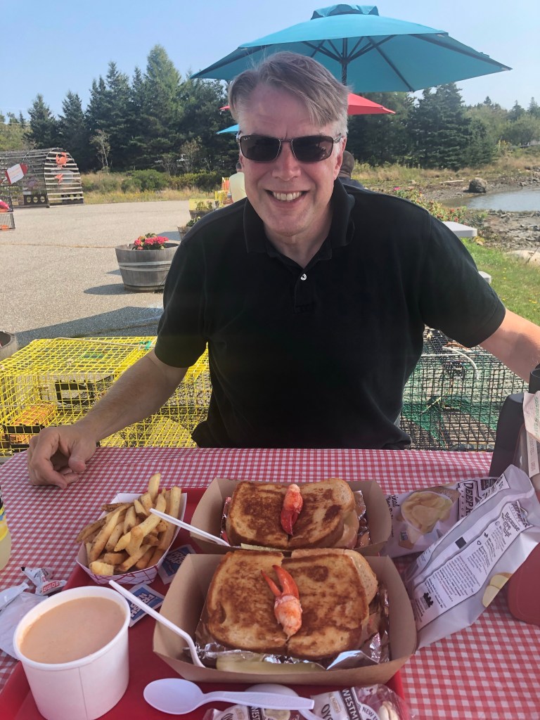 After that we drove around to the fishing village of Bernard and considered our options for lunch. Which Lobster shack should we choose. The screened in one over looking the harbour in Bernard seemed too crowded for Shay so we doubled back to Archie’s Lobster which was a food truck with a bunch of tables on pavement over looking the harbour. It seemed like the worst choice. Turns out to have been a hidden gem Russ had read about, but didn’t know this was the place.