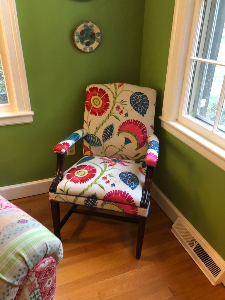 After a seventeen hour drive, split over two days I would have hated to come home to a mess. Instead I had the rest of my recovered living room chairs brought back and my dining room valances installed thanks to my friend and best decorator ever, Lane so the house looks finished.