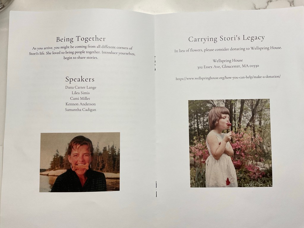 This morning we drove out to Essex for the celebration of Stori’s life. Stori’s daughter Sam messaged me that I was going to be the first of the five speakers at the service. Thankfully Nancy and I arrived early at the Essex Country Club so I got a chance to spend a few minutes with Stori’s husband John, Sam and Stori’s sister Lilea, brother’s Jeff and Pel and Mom Diecy before the throngs of Stori lovers came pouring in.