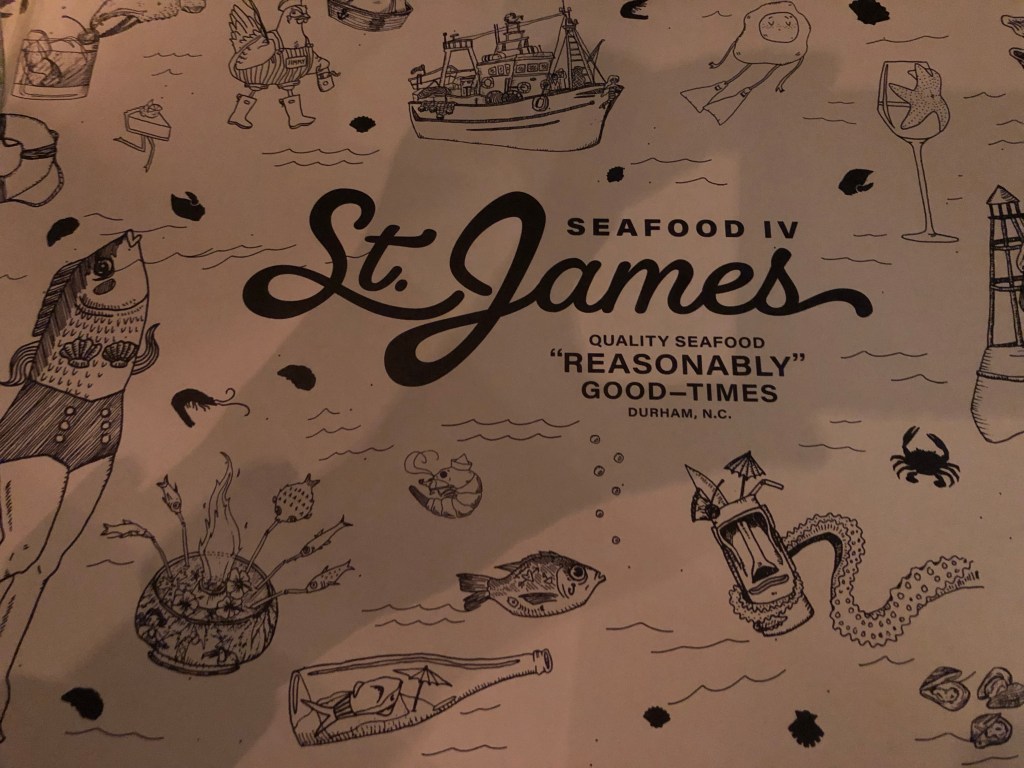 The funny thing is tonight we were seated at the same table we sat at the night before the explosion. We look forward to seeing you again soon St. James. Your motto is so Durham, “quality seafood. Reasonably Good-Times.” It’s been so much better than reasonable. It’s been just great times!