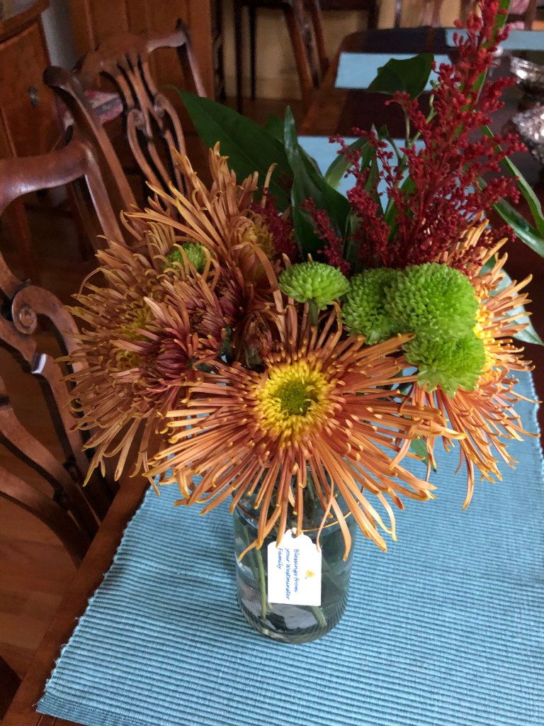 Raynor came by on official church business, to bring me these beautiful flowers since they knew of the loss of my friend. Belonging to a wonderful church like Westminster Presbyterian makes me happy on a regular day, but in times of sadness it is extra wonderful.