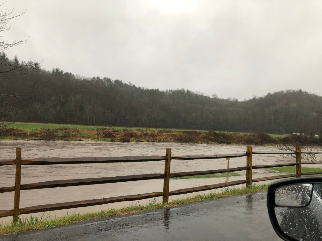 The storm had caused the New river to flood over it’s banks. As we drove along looking at how far the breach of the river had gone I was getting worried that we might come to a point where the river covered the road. I had been worried about leaves covering the road and had not considered the worse water emergency. We were really out in the middle of no where so when I saw a car coming towards us I took that as a good sign that the road was not washed out ahead.
