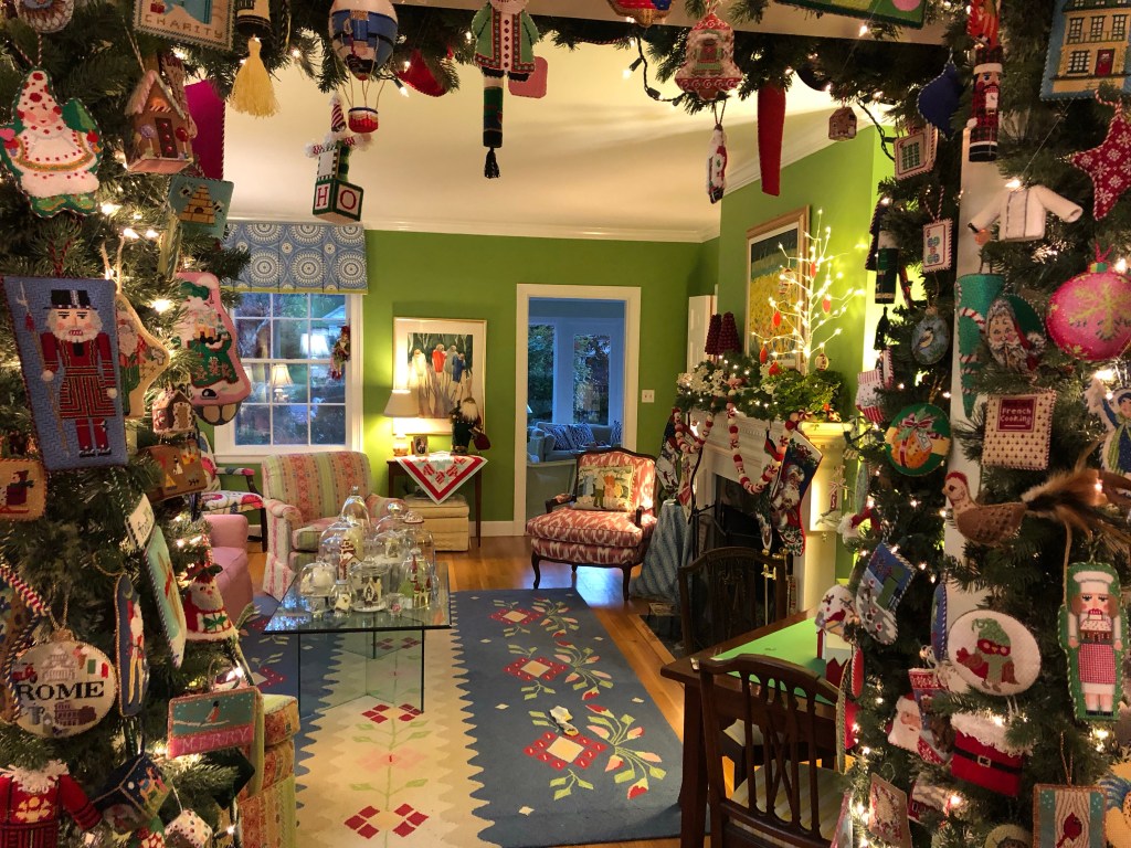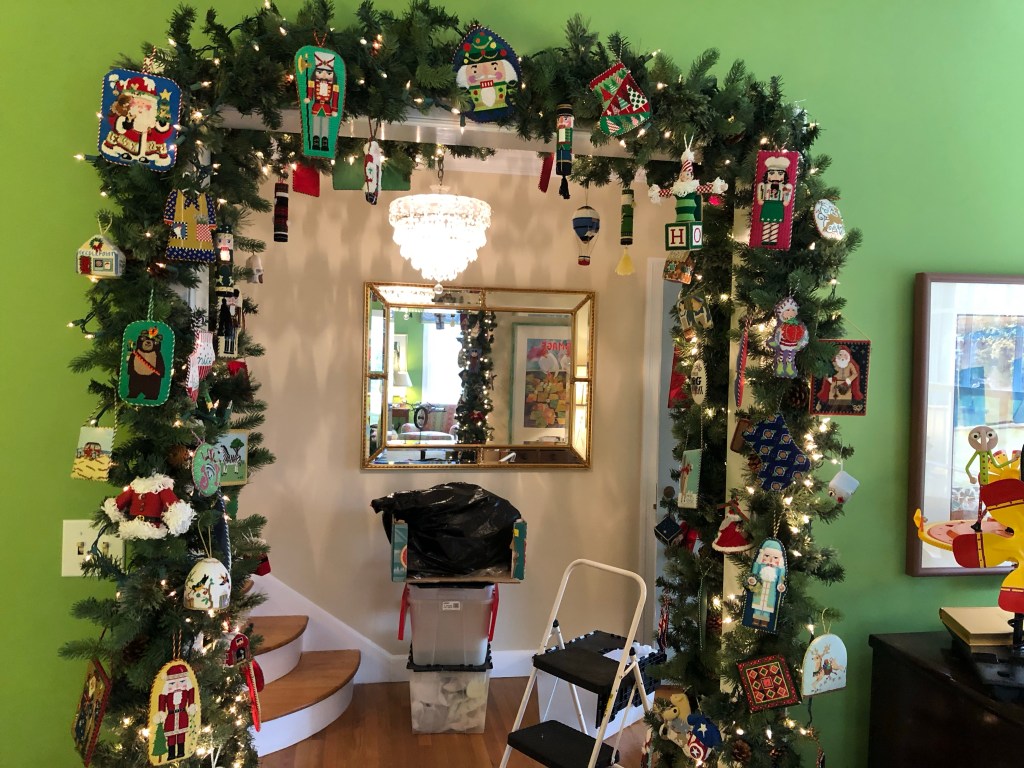 I on the other hand took quite a while to put up my needlepoint garland. I had to look at each ornament and figure out where I was when I stitched it. Going up and down the step ladder took a while. I eventually got that job done, then I moved on to decorating the rest of the living room.
