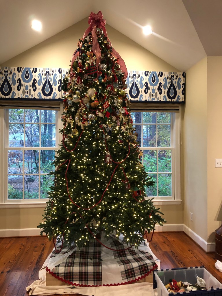 Russ and Carter did their jobs in precision. They got all the boxes out of the attic. They brought the tree in and set it all up. Russ even programmed the lights to come on with a voice command.