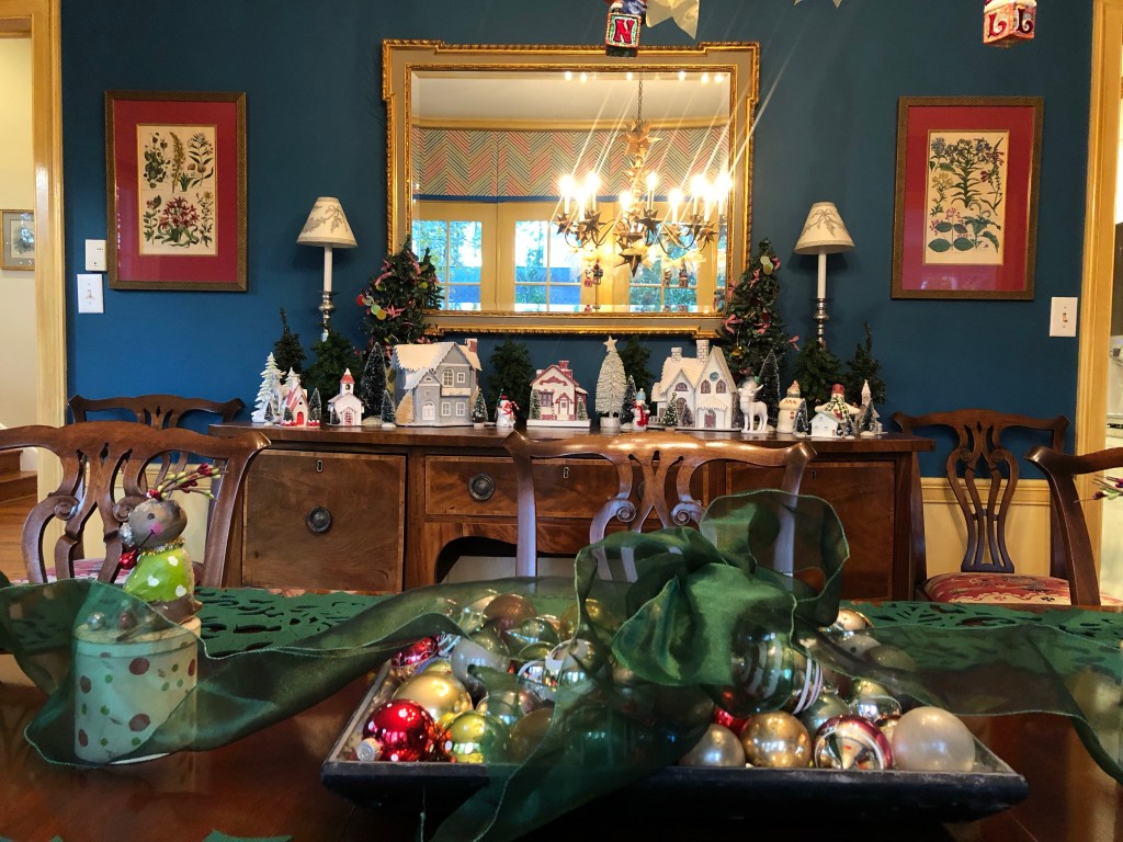 I love the new color of the dining room with the Christmas village. I still need a bunch of wreaths and command hooks. I never knew that the command tape would go bad, but it did.