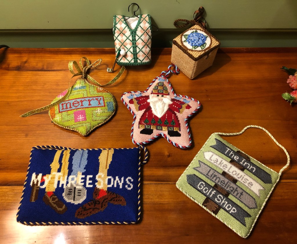 For eight years my group of stitching advisors has had a needlepoint Christmas ornament exchange. I was very honored to be invited to join this group of accomplished stitchers. In January we draw names and secretly make an ornament for our person. Needlepoint ornaments are works of art. Non-stitchers have no idea the time or cost that goes into making them. So creating one for another stitcher is the only way to get the level of appreciation such a gift deserves.