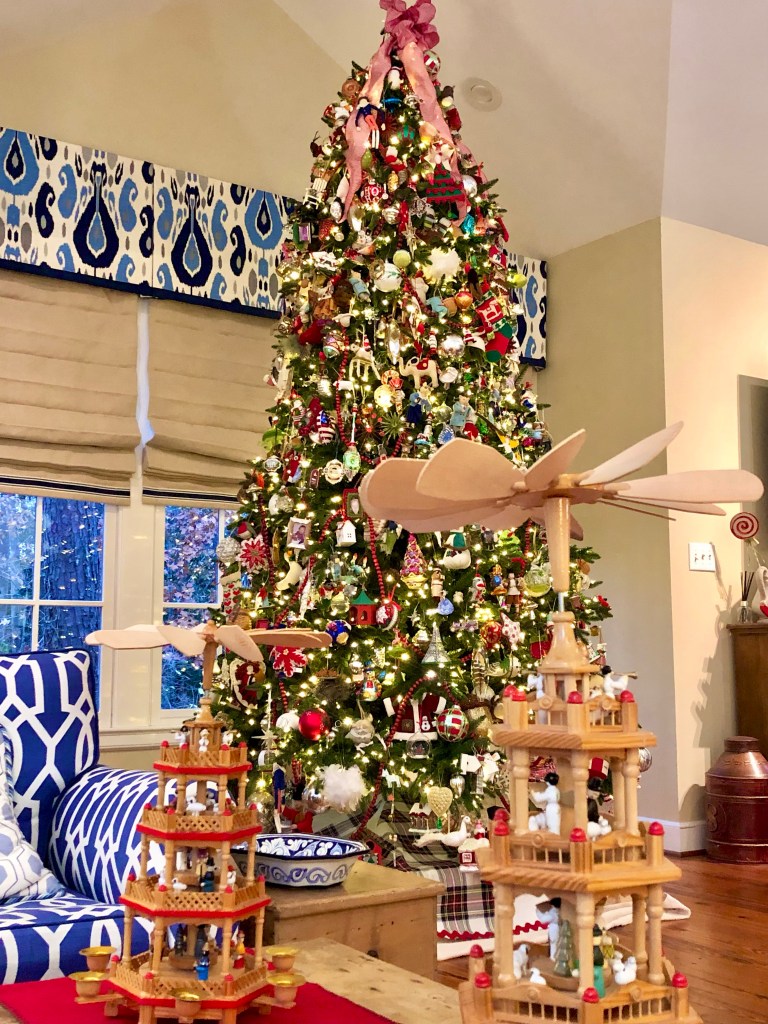 When the tree is up in the gathering room it draws me to want to sit in there all by myself. My favorite view is from the sofa, looking through two German Christmas Carousels at the Christmas tree. I could look at the tree all day and never think, maybe I should be doing something more productive.