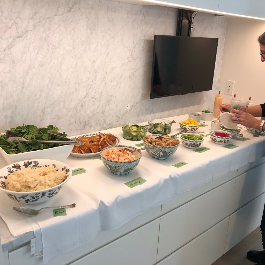 This year we had the party at Lynn’s new house. We have been waiting a long time to do it there. It is such a beautiful place and everything was so elegant. Lynn set up two tables and we served lunch on the bar of her kitchen. I made make-your-own Poké bowls, but not with raw fish. I didn’t want to kill anyone this close to Christmas. Plus I have lost enough friends this year.