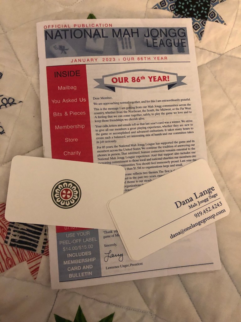 This is just a reminder to go head and order your 2023 cards now. They won’t be mailed until the very end of March, but the sooner you order the greater your chance of getting your new card in time to play it on April 1, the start of the new Mah Jongg year.