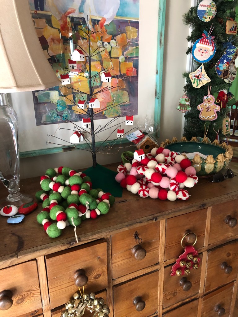 After the needlepoint I carefully dismantled and wrapped the village under glass that takes up the whole coffee table. I had to windex the table before putting back the year-round decorations.