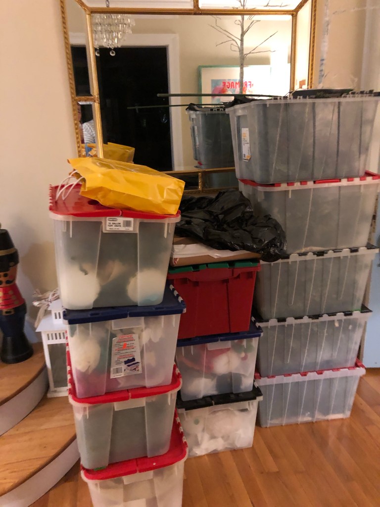 A few years ago I labeled all the boxes so when Russ removes them from the attic he can take them right to the room where they will be unpacked or repacked. Today I finished filling all the boxes. They are currently scattered about the house since it was a work day for Russ. I figure tomorrow we will put them in the attic. I went around counting the boxes and found it was over 60. Sadly wreaths don’t fit in those boxes so I still have makeshift containers for them.