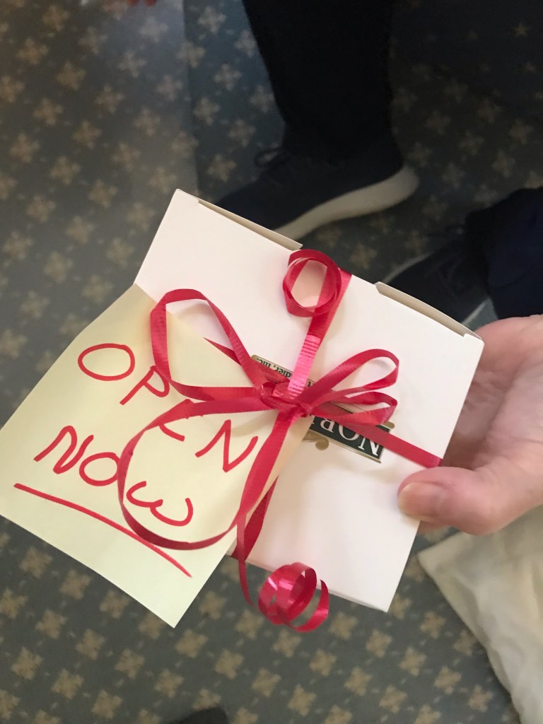 We exchanged gifts for a while, but after hardly making a dent we decided we needed to eat lunch to recharge for more opening.