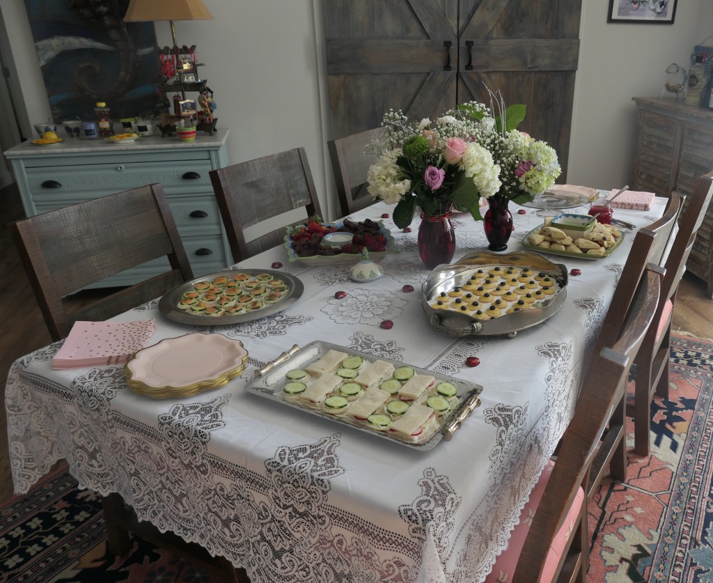 So much fun to be invited to Jan’s house for a tea party today. Jan inherited a lot of beautiful tea cups and has enjoyed having tea parties with her grand children. I was thrilled she decided to have one for her new neighborhood friends along with some of us old friends.