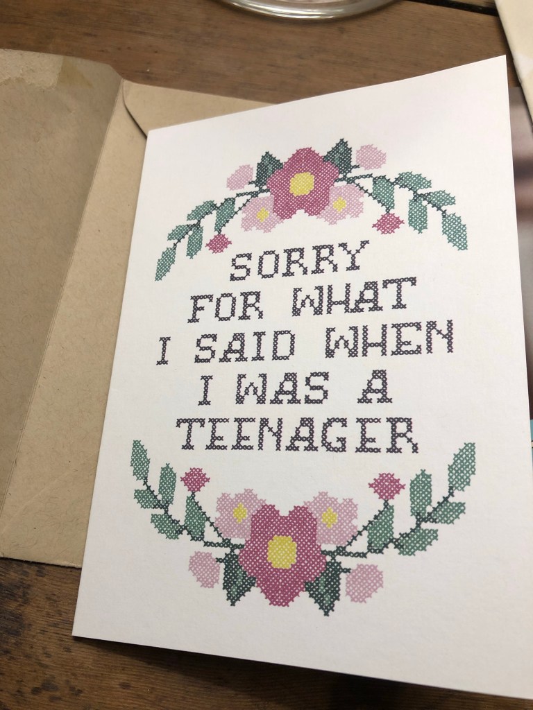Probably a better card from her is “Sorry for the mean stuff I thought, but never said, when I was a teenager.”
