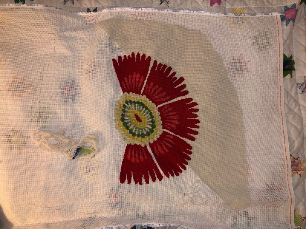 I am about half way through stitching the first seat of my four game table chairs. Since I am doing it freehand I did not bother to paint the canvas. Working on the background is so boring. The seat is 26”x23”. That’s just big.